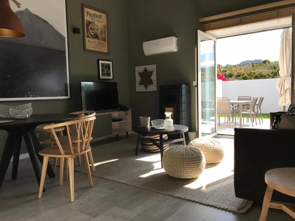 Uma sala de estar com sofá-cama e terraço privativo com mesa de exterior e sofá.