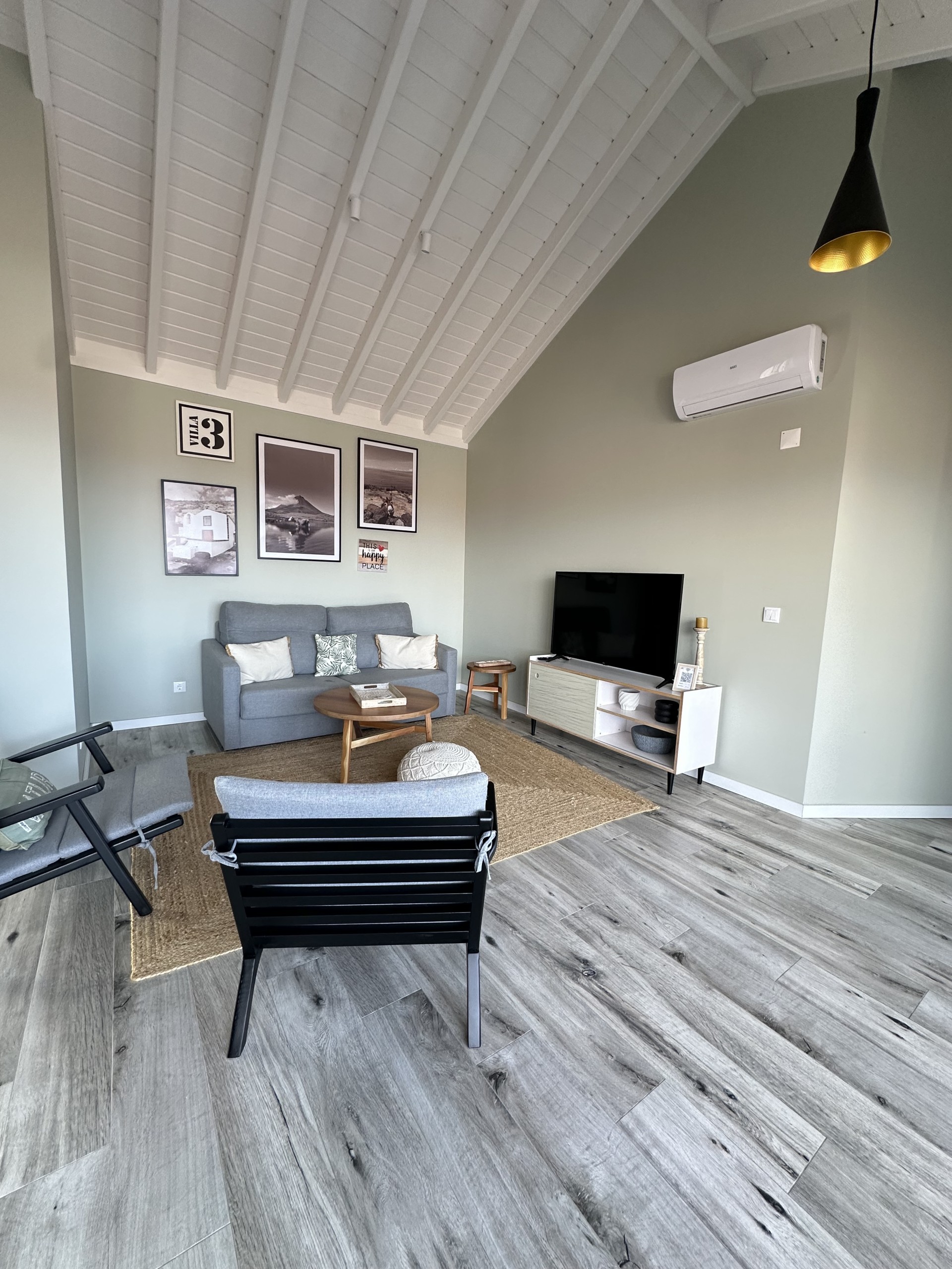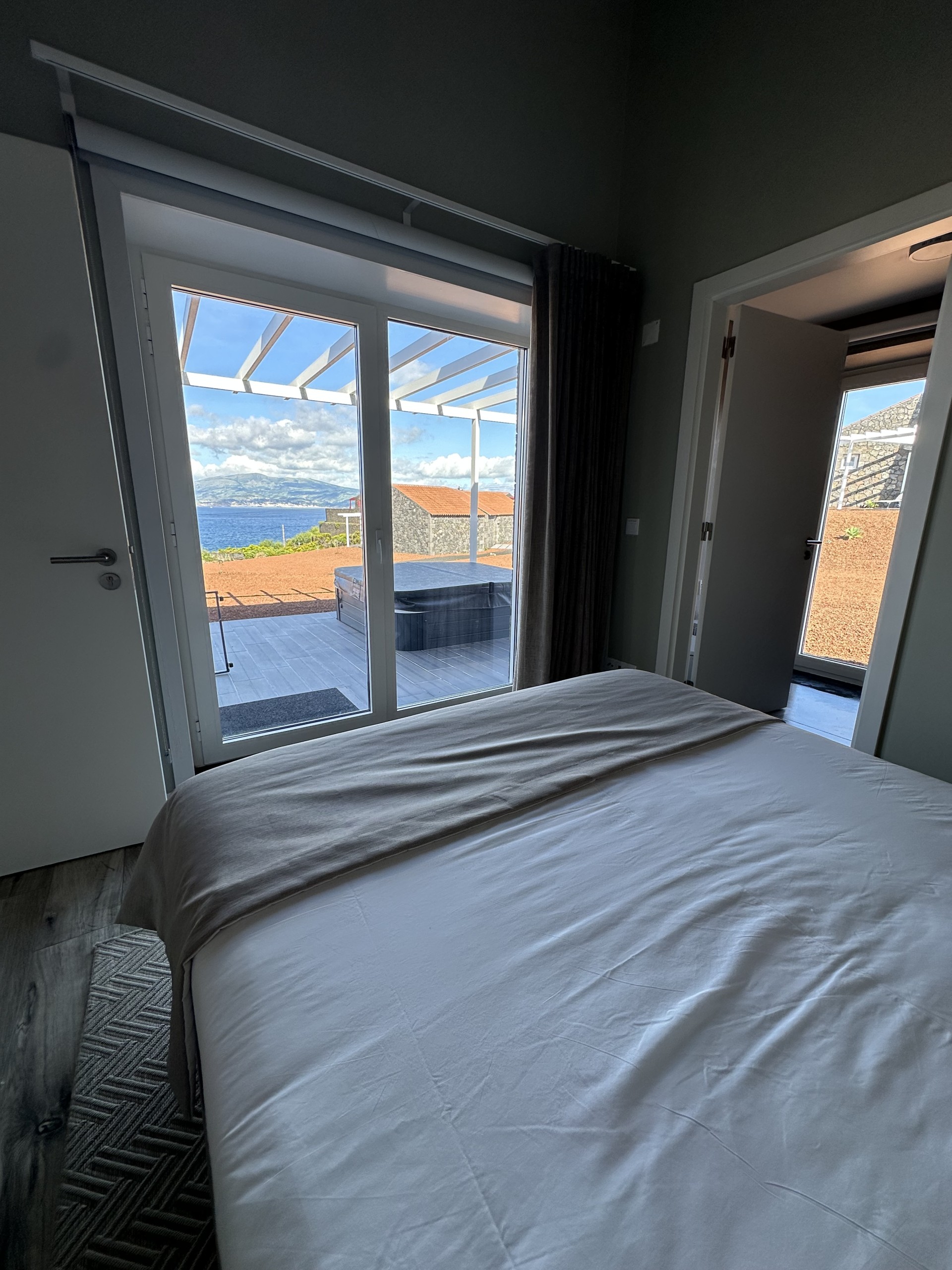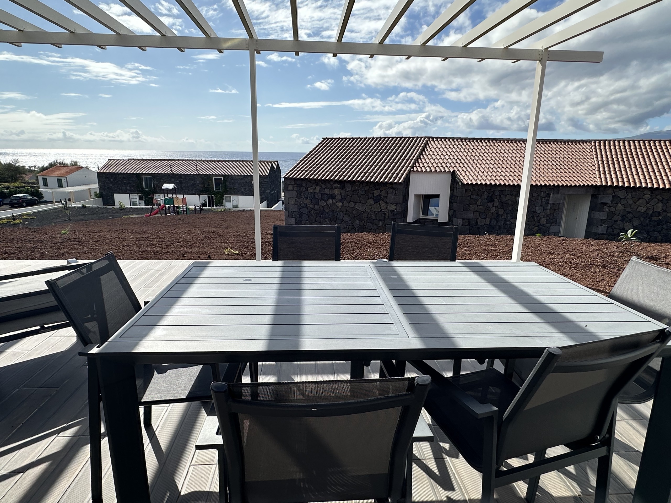 Porto do Calhau, nº42Vila T1 vista mar com um quarto e casa de banho privativa, sala de estar com sofá-cama e área de refeições, e terraço privativo equipado com mesa exterior e espreguiçadeiras.