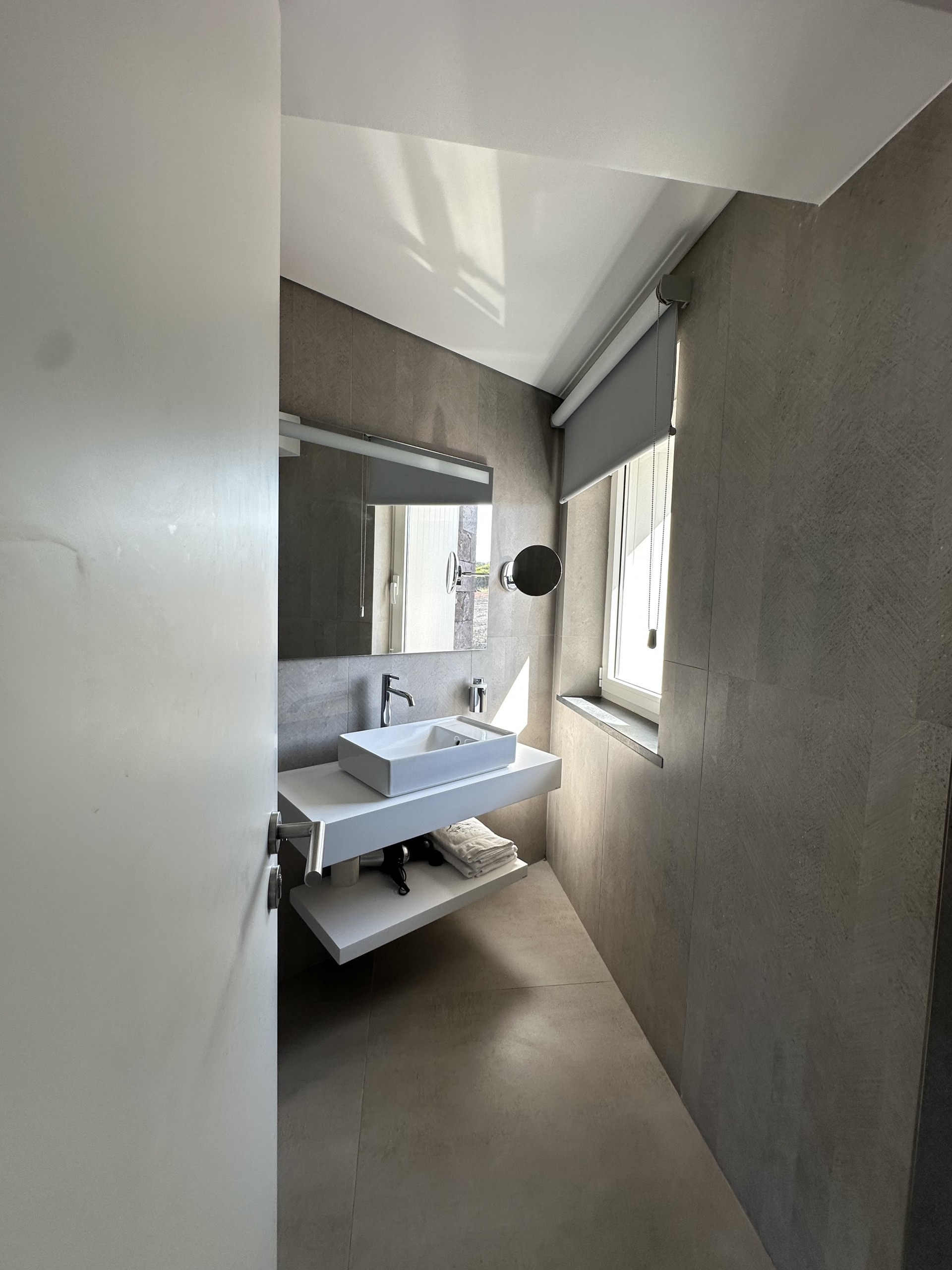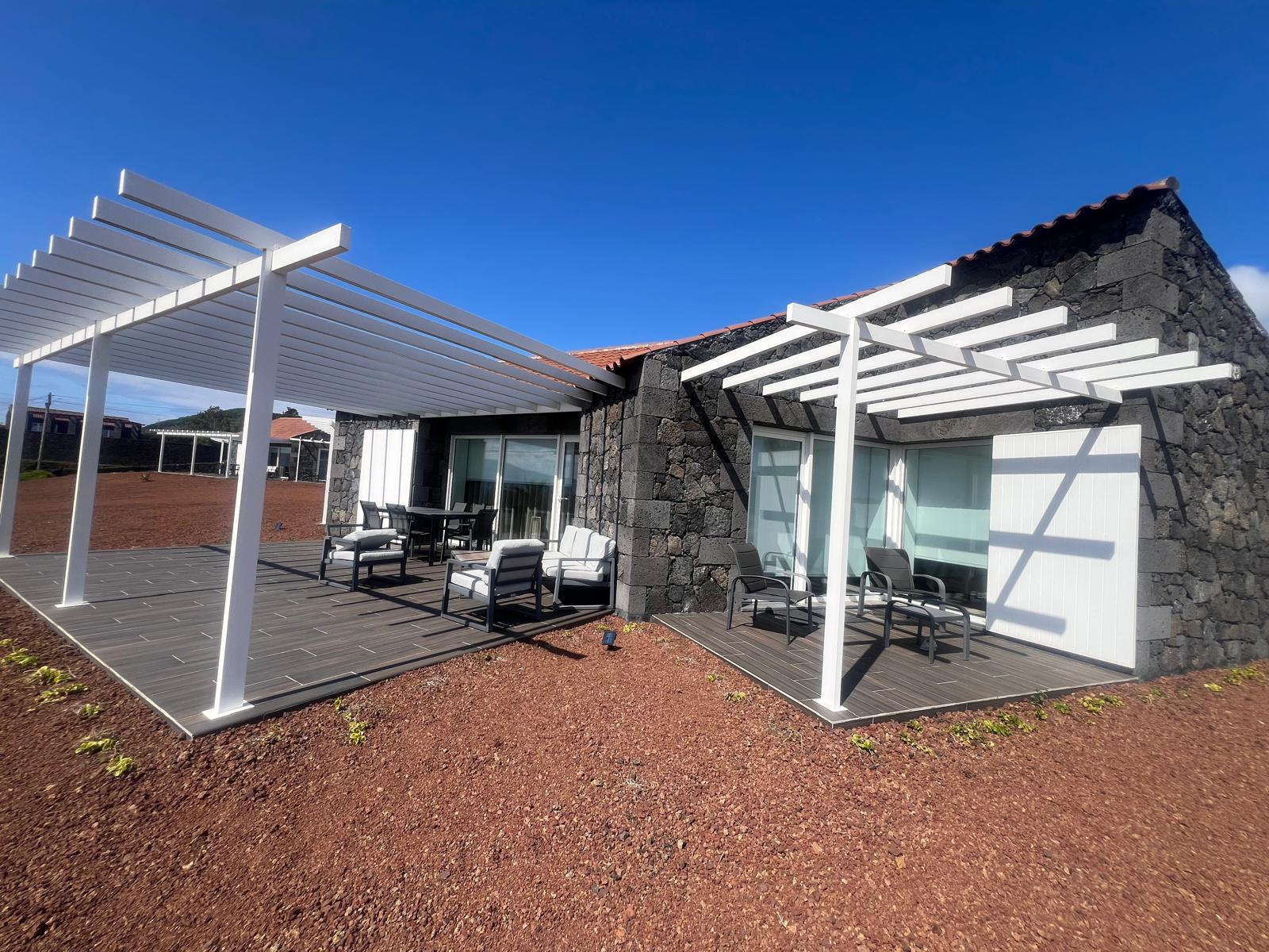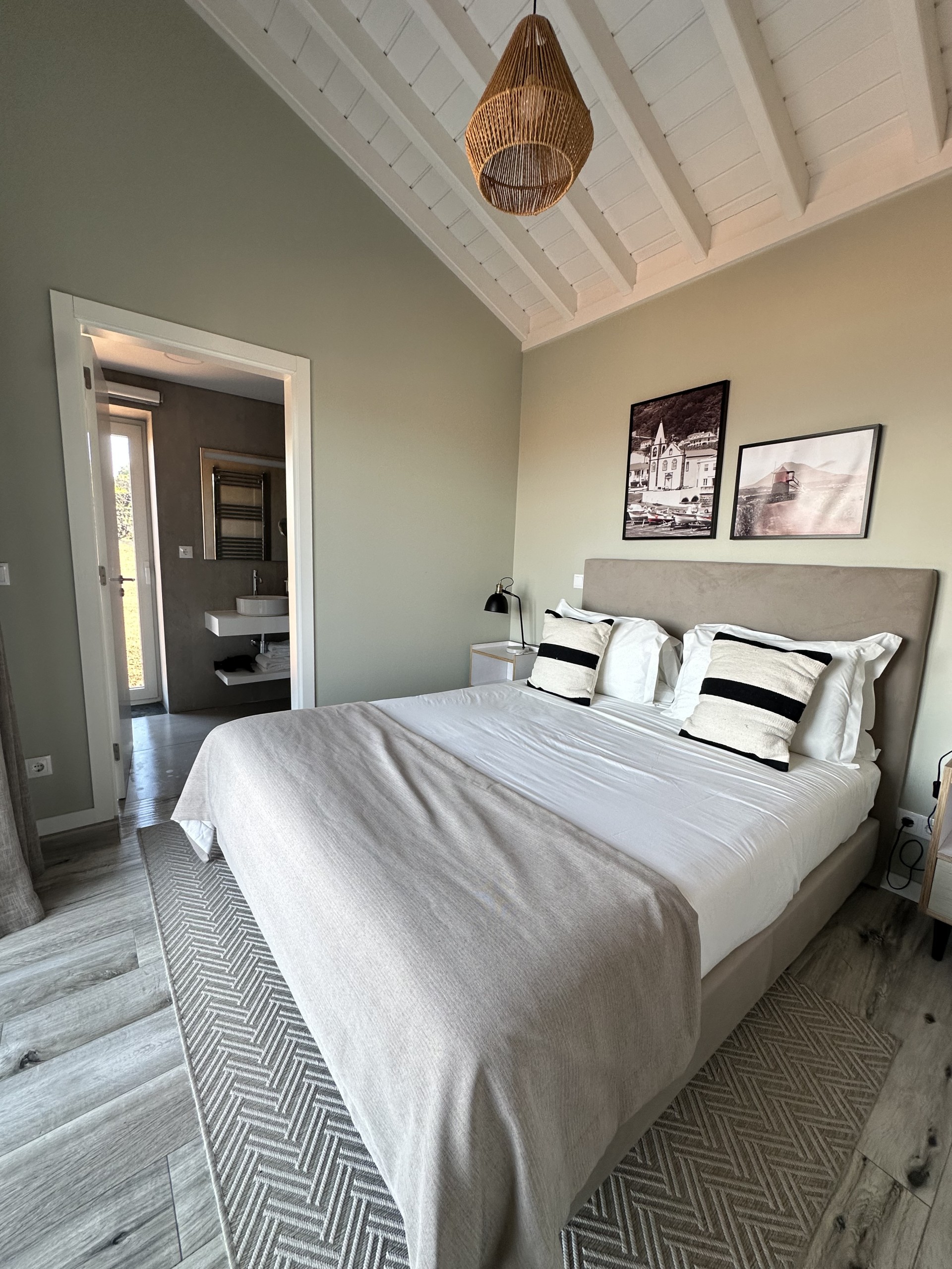 Porto do Calhau, nº42Vila T1 vista mar com um quarto e casa de banho privativa, sala de estar com sofá-cama e área de refeições, e terraço privativo equipado com mesa exterior e espreguiçadeiras.