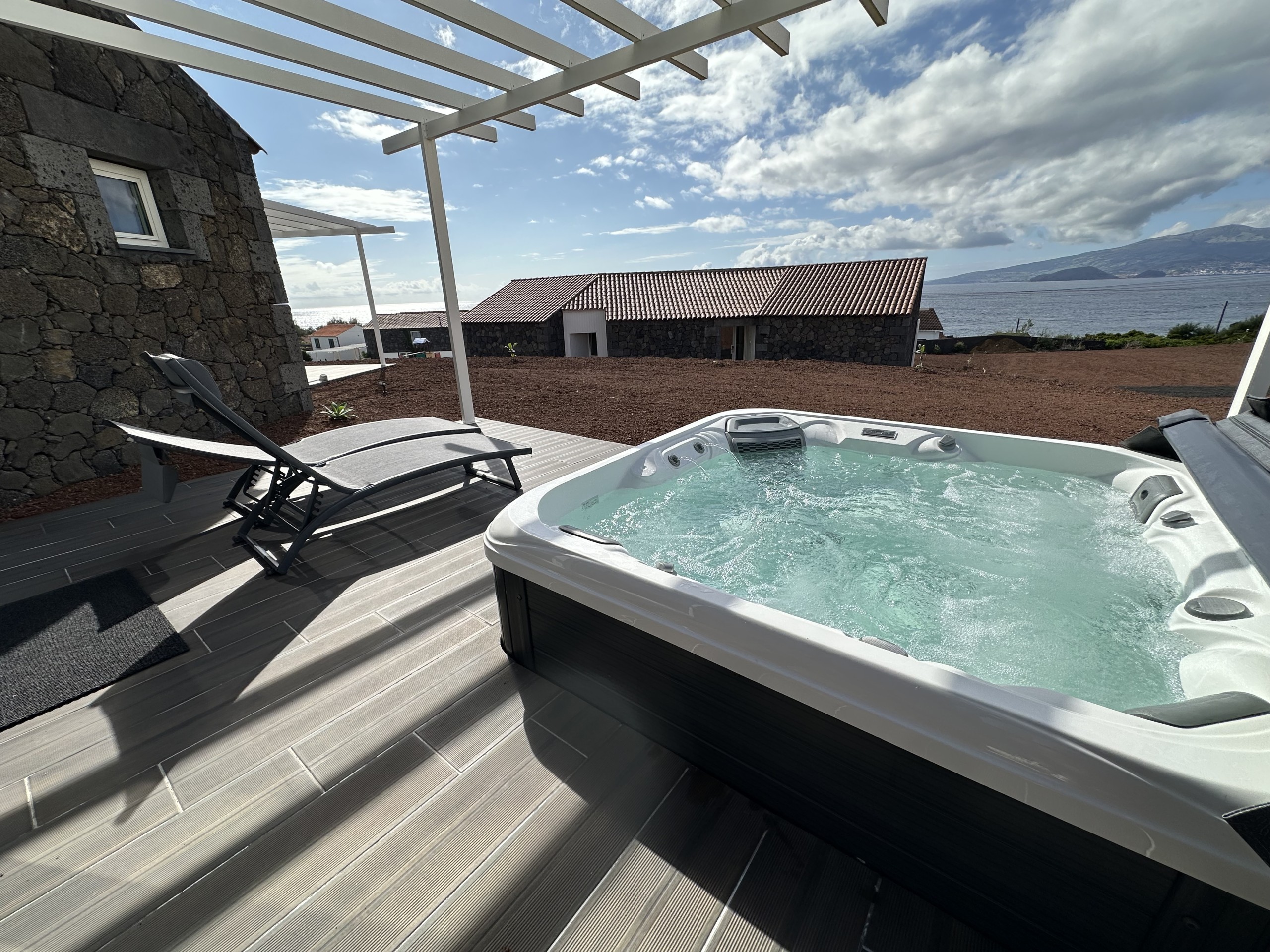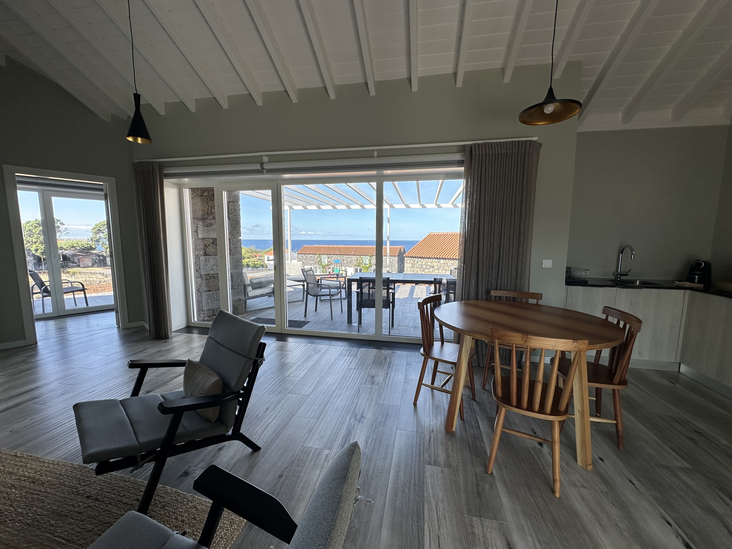 Vila T2 vista mar com dois quartos, ambos casas de banho privativa, sala de estar com sofá-cama e área de refeições, e terraço privativo equipado com mesa exterior e espreguiçadeiras.